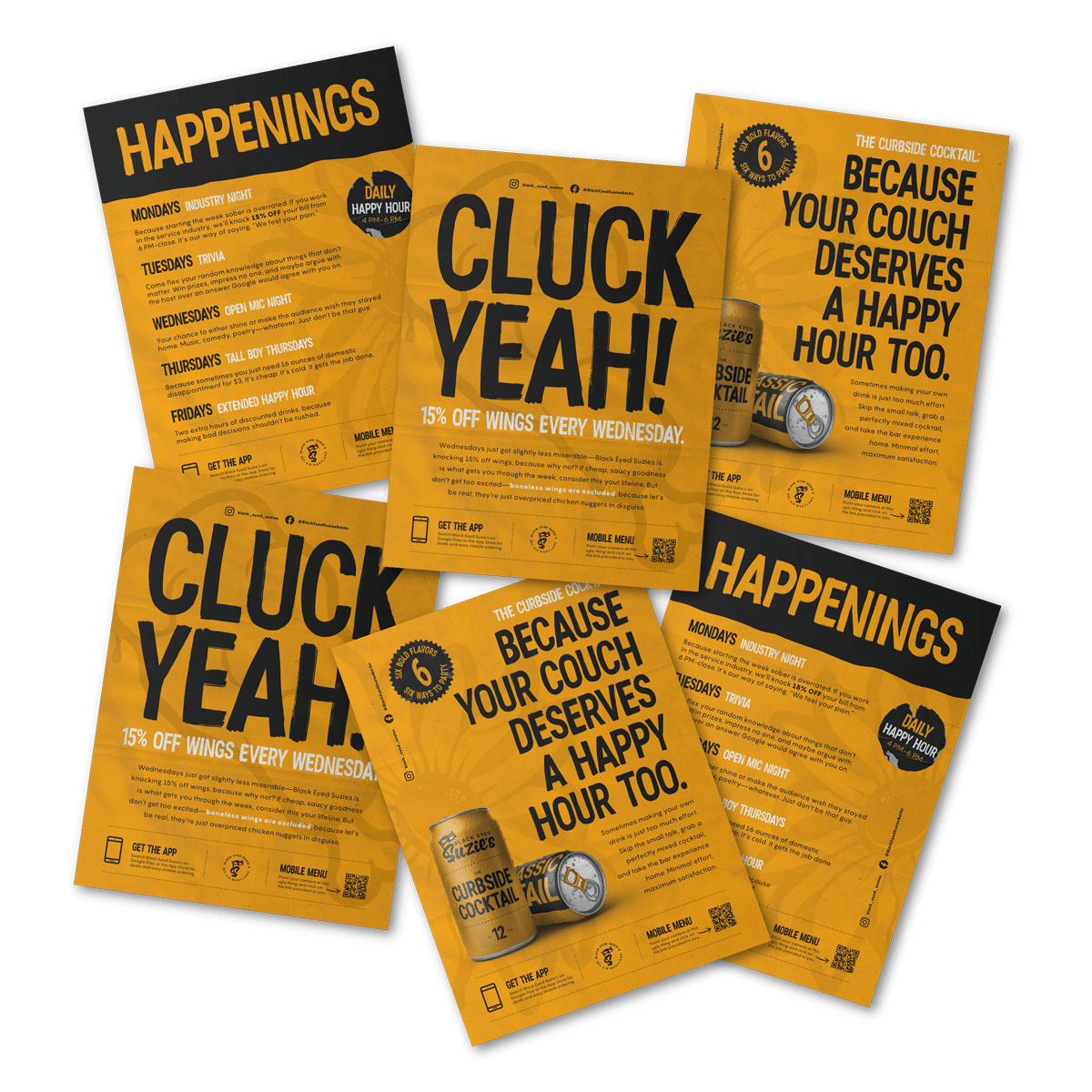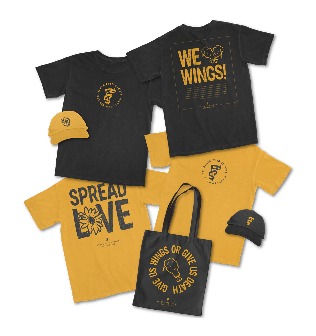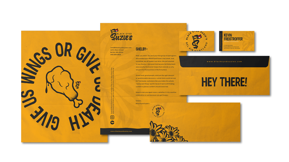 When rebranding Black Eyed Suzie’s, the goal was to create a look that felt like a natural evolution, fresh but familiar. The old brand leaned heavily on stark white menus and scattered Maryland flag motifs, resulting in a disjointed feel. I simplified things by stripping the flag down to its essence: the colors. Instead of using the flag’s design, I pulled its most recognizable elements: yellow, black, and just a hint of red and white. The result was a bold, ownable palette that felt unmistakably local without being cliché. It stood out, felt intentional, and finally matched the energy and attitude of Suzie’s.