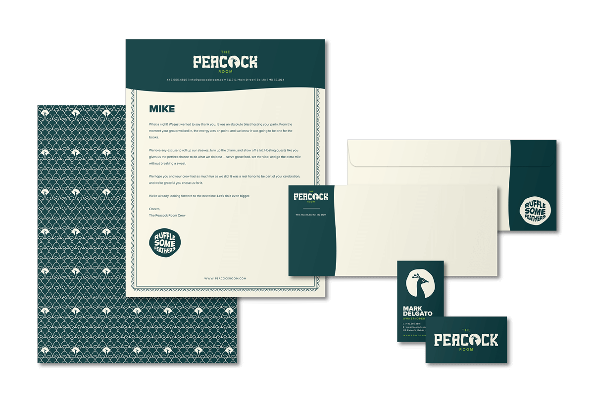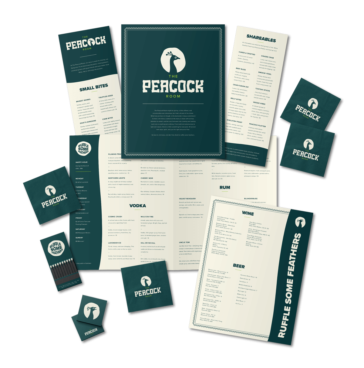 The Peacock Room’s branding and graphic design came alive across every element, seamlessly blending its moody, maximalist vibe with unexpected elegance. From the custom-designed menus and beverage napkins to matchbooks and interior wallpaper, each branded touchpoint reflected the playful yet refined spirit of the logo. The brand’s laid-back slogan, “ruffle some feathers,” perfectly captures its quirky, unapologetic personality, while the squawking peacock brand mark adds a bold, cheeky element prominently featured in marketing materials. This cohesive restaurant branding and visual identity invite guests to step into a world where kitsch meets sophistication, making every visit feel like a stylish, well-kept secret.